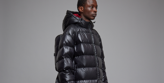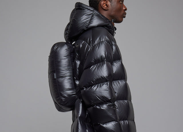 Picture yourself strolling down the busy urban streets, then hitting the open road for your next adventure. The 'Anywear' sleeping bag coat is designed for both urban and outdoor use, featuring a sustainable and sleek black recycled rip-stop nylon exterior and deep red interior lining. It allows for a seamless transition between city exploration and outdoor adventures.